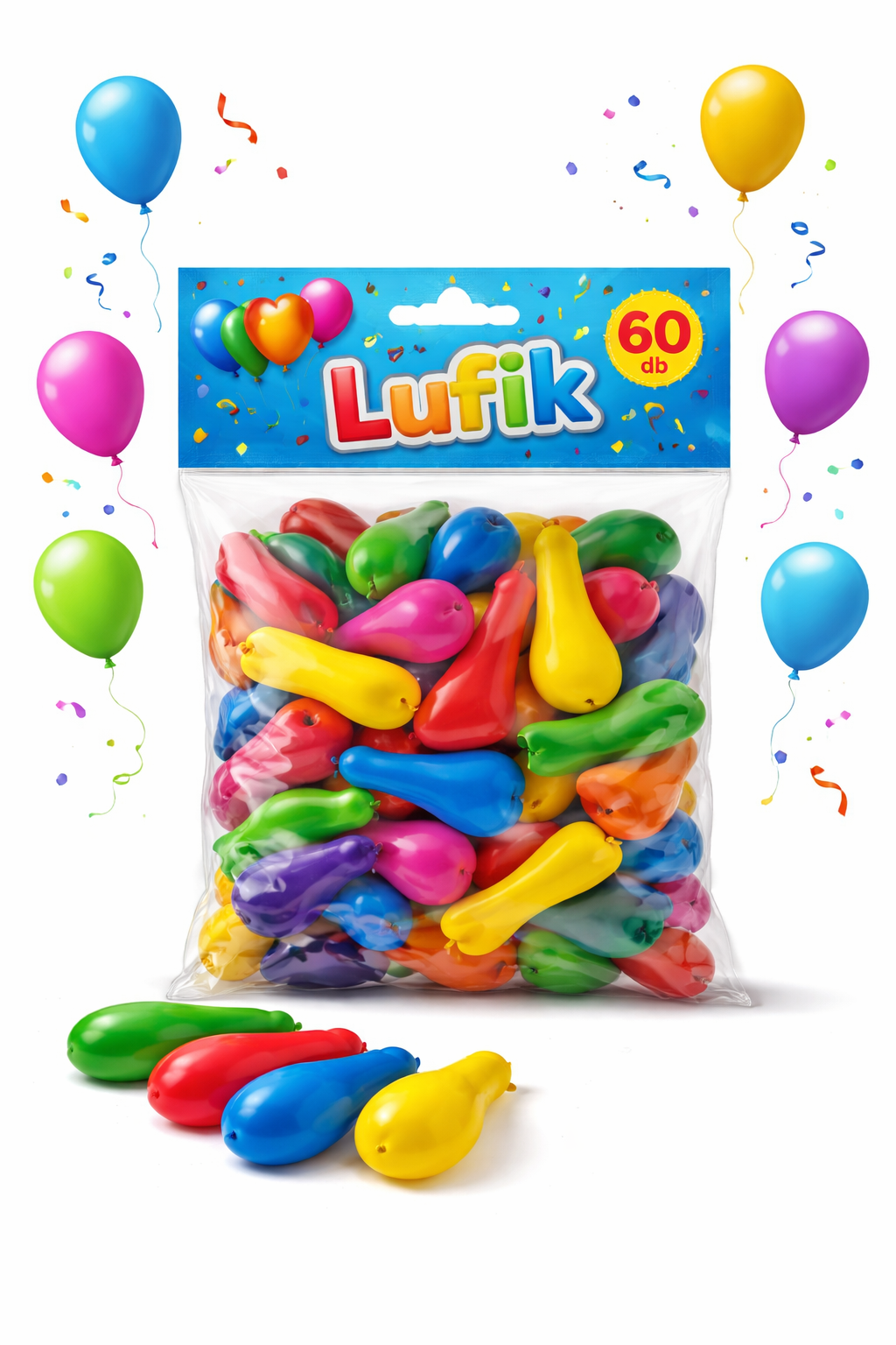 Hagyományos, 60 darabos színes lufi csomag, ideális születésnapokra, bulikra és ünnepi dekorációhoz. Egyszerűen használható, vidám hangulatot teremt.