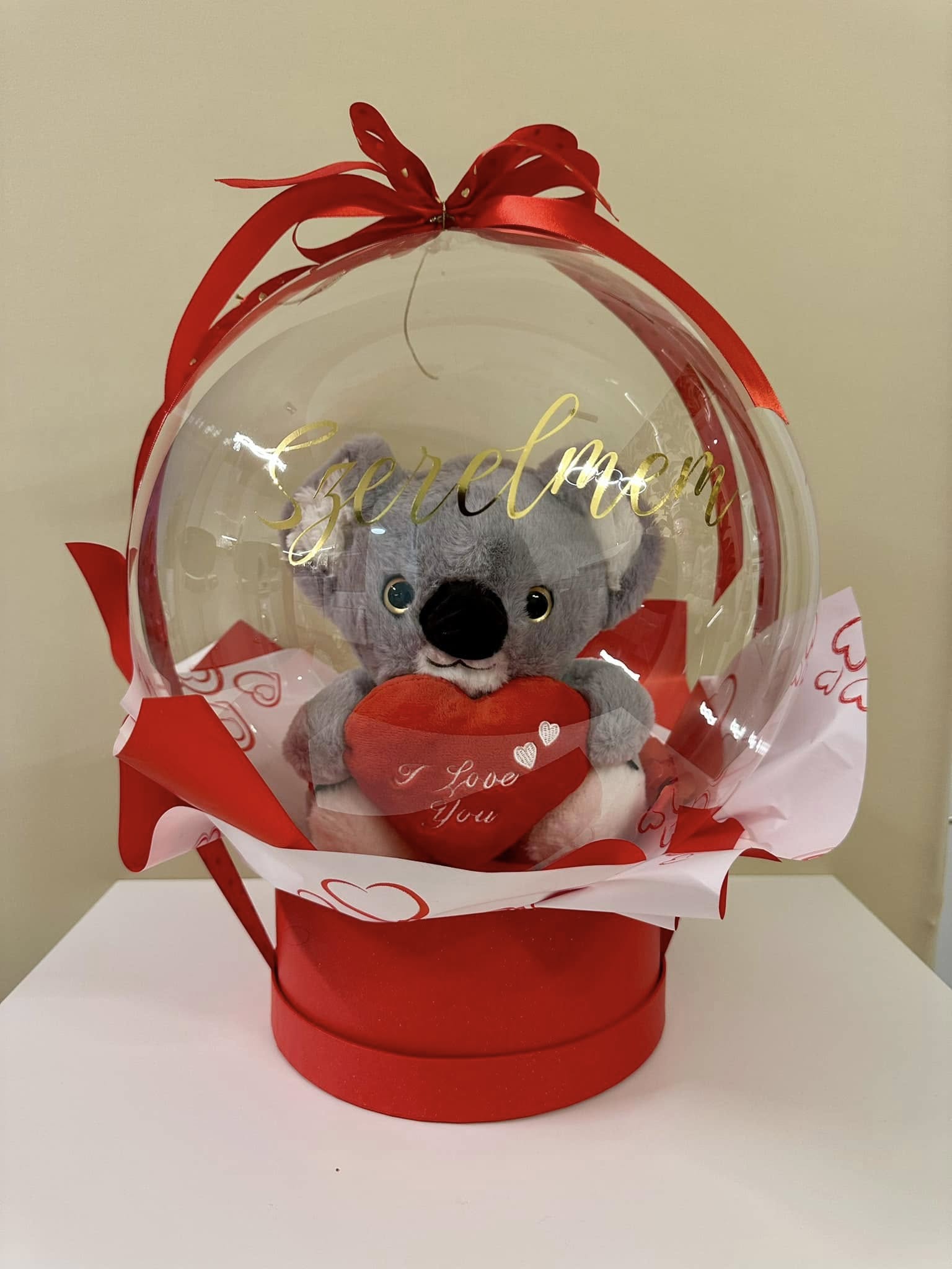 Valentin napi örök lufi box arany „Szeretlek” felirattal és arany masnival, cukorka koala dekorációval. Elegáns és vidám ajándék, amely hosszú ideig emlékezetes marad.